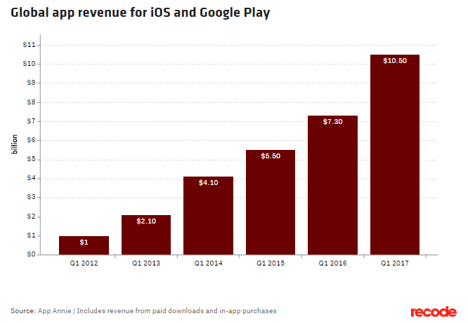 2017 yılının ilk çeyreğinde, App Store ve Google Play’deki indirme ve uygulama içi satın alma işlemleriyle elde edilen gelir, 10.5 milyar dolara yükseldi. Buna, Amazon’daki satın alma işlemlerinden elde edilen gelir gibi uygulama içi reklamcılık veya ticaretten elde edilen gelirler dahil değil.