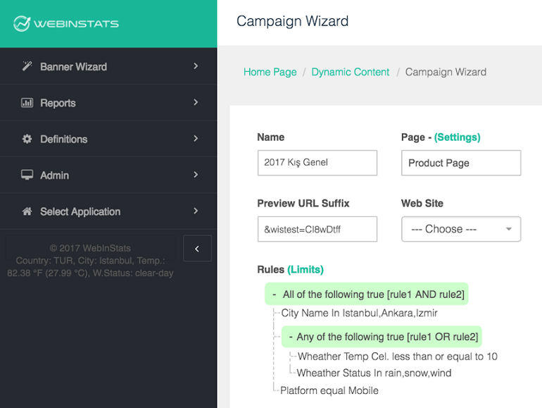 Firmamızı 2015 yılında kurduk. İlk olarak 2015 kasım ayında Onsite Marketing ve Personalization ürünümüz olan Dynamic Content’i geliştirdik. Daha sonra WIS WebPush ve WIS Form isimli ürünlerimizi portföyümüze ekledik. Dynamic Content ürünümüz dakikalar içinde dilediğiniz kampanyayı yayına almanızı ve kampanyanın detaylı raporlamalarını görmenizi sağlayan bir ürün. Ayrıca GeoIP, Hava Durumu, kullanıcının ziyaret davranışlarına göre birçok kampanya üretebiliyorsunuz. Basit bir örnek vermek gerekirse Ankara’dan sitenizi ilk kez ziyaret eden kullanıcılara hava sıcaklığı 0 derecenin altında ise kar lastiği ürününü, hava sıcaklığı 20 derecenin üstünde ise klima ürünü tanıtabiliyorsunuz ve bunu 30 saniye gibi kısa bir sürede yapıp yayına alabiliyorsunuz. Ya da belirli davranışları uygulayan kullanıcılarınıza özel kupon kodları vererek satışların artırılmasını sağlayabiliyorsunuz ve A/B testleri ile değişik görseller ve metinler göstererek hangi iletişimin daha etkili olduğunu gerçek zamanlı olarak görebiliyorsunuz.