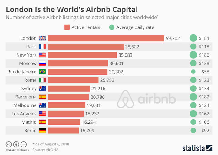Neyse ki Airbnb’nin yükselişi, şehir turizmindeki büyük artışla kesişti. Otel odası bulmanın zor veya pahalı olduğu Londra, Paris veya New York gibi şehirlerde Airbnb, şehirleri daha az turistik bir şekilde tecrübe etmenin ekonomik ve popüler bir yolu haline geldi. En başından beri otel endüstrisi bu platforma karşı çıkarken, aynı zamanda pek çok alanda uygun fiyatlı konut sıkıntısını da kötüleştirmesine yönelik popüler şehir gezisi yerlerinde ikamet eden kişilerin eleştirilerini önemli ölçüde artırdı. Bazı şehirlerden gelen itirazların sayısı göz önüne alındığında, eleştiriler tamamen haksızlıkmış gibi görünmüyor. Aşağıda bulunan AirDNA’nın verilerine dayanan grafik, Airbnb’de hangi şehirlerin özellikle popüler olduğunu gösteriyor.