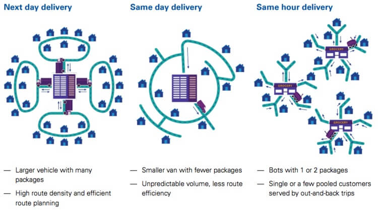 KPMG, araçların çoğunluğunun “anında” teslimat için kullanılmasını bekliyor. Ancak, şirketlerin müşterileri daha yavaş veya daha esnek gönderim seçeneklerini seçmeleri için teşvik etmeye çalışabileceğini varsayabiliriz. Örneğin Amazon, şu anda, şirketin ücretsiz iki gün içinde teslimatı yerine daha yavaş bir gönderim seçeneğini seçmeleri durumunda üyelerine Prime Now kredisi sunarak bunu bir ölçüde gerçekleştiriyor.