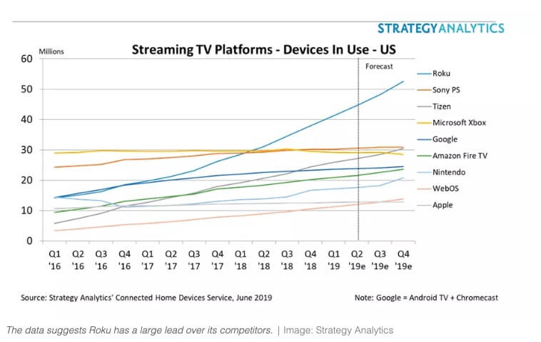 Strategy Analytics’e göre, en popüler beş streaming cihazı Roku, Playstation, Xbox, Samsung (Tizen) ve Chromecast cihazlarının yanı sıra Android TV’yi de içeren Google’ın yazılımları üzerinde çalışıyor.
