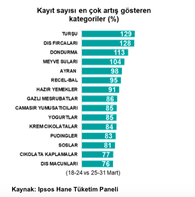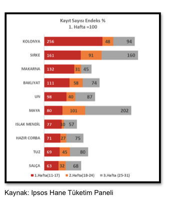 Ipsos Hane Tüketim Paneli’ne göre; Türkiye’de hanelerin hızlı tüketim ürünleri satın alımlarında en yüksek sayıda tercih ettiği 5 kategori sıralaması ise değişmedi, bu kategoriler “Bisküvi & Kek, Süt, Çikolata Kaplama, Peynir ve Makarna”. Bu kategorilerde kayıt sayısı artışı ilk tepkiye göre daha yüksek oranda artış gösterdi. Sadece Makarna artış oranı 3. haftada daha düşük kaldı. Çünkü Makarna ilk hafta stoklamanın en yüksek olduğu kategoriydi.