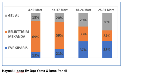 Ipsos Ev Dışı Yeme & İçme Paneli sonuçlarına göre ise; restoran ve kafelerin sadece sipariş ve Gel-Al ile hizmet vermesinin etkisi ile eve sipariş oranı ve gel al oranı arttı. Eve siparişte en yüksek artış pide, pizza ve kebap / döner ürünlerinde, gel -al da ise simit, poğaça, döner ve çiğ köfte artış gösterdi. Eve sipariş ilk hafta toplam siparişlerin içerisinde %13 paya sahipken son hafta bu oran %38’e yükseldi.